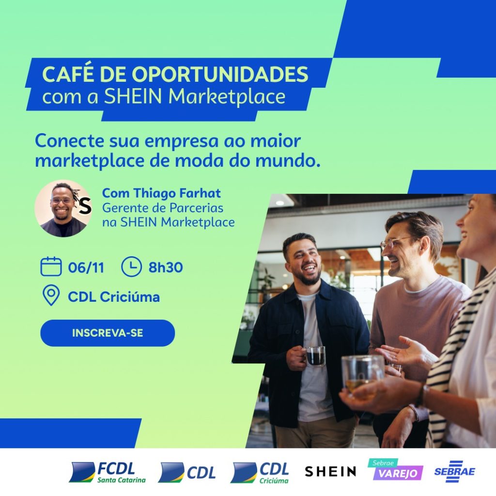 A Câmara de Dirigentes Lojistas (CDL) de Criciúma, em parceria com o SEBRAE/SC, realiza no dia 6 de novembro, às 8h30, na sede da entidade (Rua Coronel Pedro Benedet, Edifício Martinho Acácio Gomes, 4º andar, Centro), o Café de Oportunidades com a SHEIN Marketplace. O evento é gratuito, exclusivo para associados e tem como objetivo apresentar as funcionalidades da plataforma e oportunidades de negócios para empreendedores e empresários da região.